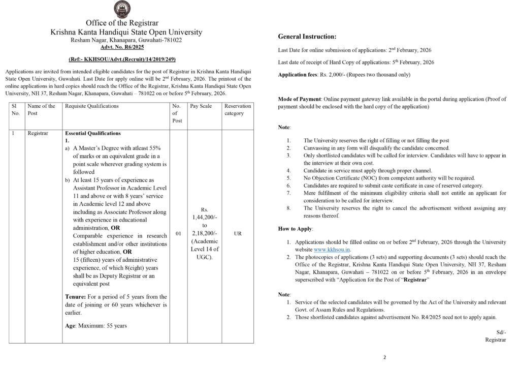 Krishna Kanta Handiqui State Open University (KKHSOU), Guwahati, has released an official notification inviting applications for the post of Registrar. Eligible and interested candidates can apply online on or before 2 February 2026. The hard copy of the application must reach the university office by 5 February 2026 .