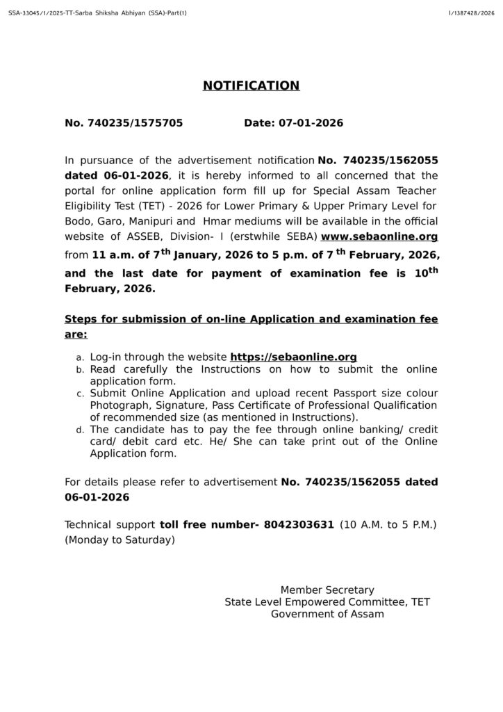 This Special TET is conducted under Section 23 of the RTE Act, 2009 and follows NCTE guidelines. Qualified candidates will become eligible to participate in future teacher recruitment processes in Assam, subject to fulfillment of other academic and professional requirements.